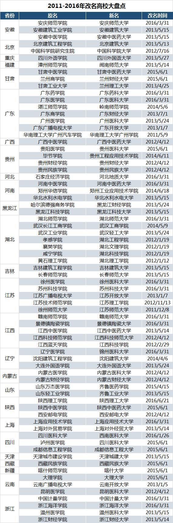 看看大家是怎么改的呢?改名的院校中,大部分是“学院”改成了“大学”,看看2011-2016年间改名的学校有哪些吧!(部分数据)