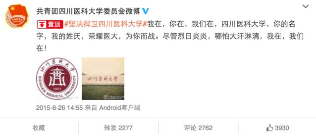 在泸州医学院一方,微博上出现了#坚决捍卫四川医科大学#的话题:“2015.4 我校合理、合法、合规的更名为四川医科大学。新校名授牌仪式完成,四川大学华西医学中心一改最初恭喜祝贺的态度,强烈反对。6 月 26 日全校学子在校内集体发起诉求:坚决捍卫四川医科大学!”