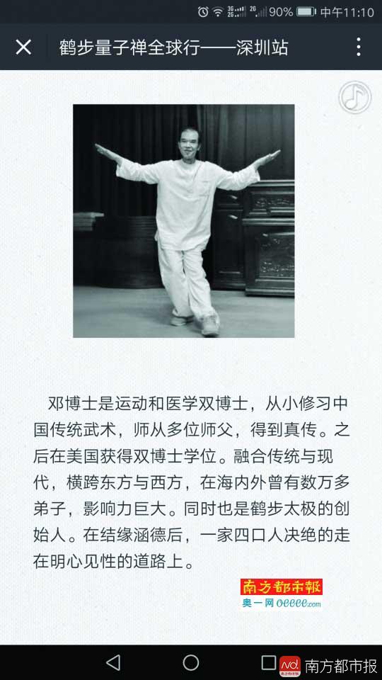 在深圳涵德智心凯发网址官网检索,邓钧允为签约讲师之一。上过力量之源、灵性财商,考过绿带班,邓钧允在公开场合直言,包剑英是他的恩师,自己在力量之源课程中得到重生,谈到鹤步量子禅和力量之源的关系,邓钧允说,“鹤步量子禅相当于小力量之源”。